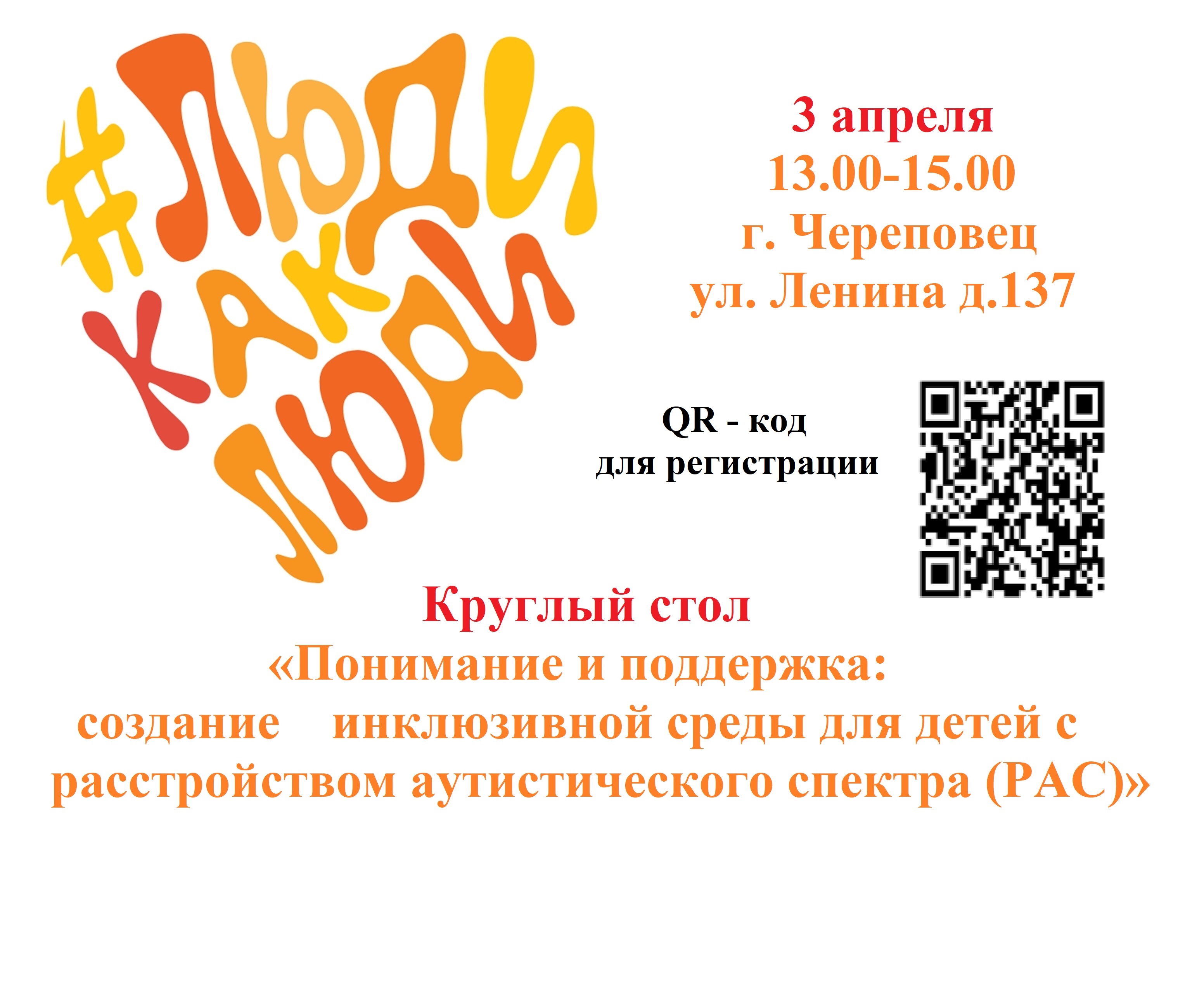 💢3 апреля в 13.00 на базе БУ ВО "Череповецкий центр ППМСП" пройдет круглый стол «Понимание и поддержка: создание инклюзивной среды для детей с расстройством аутистического спектра (РАС)».
