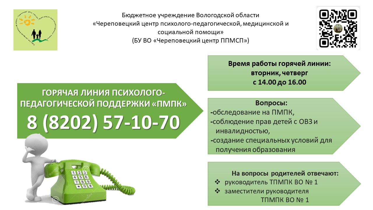 В БУ ВО "Череповецкий центр ППМСП" продолжает работу ‼ горячая линия психолого-педагогической поддержки "ПМПК" по вопросам создания условий для получения образования детьми с ограниченными возможностями и/или инвалидностью.